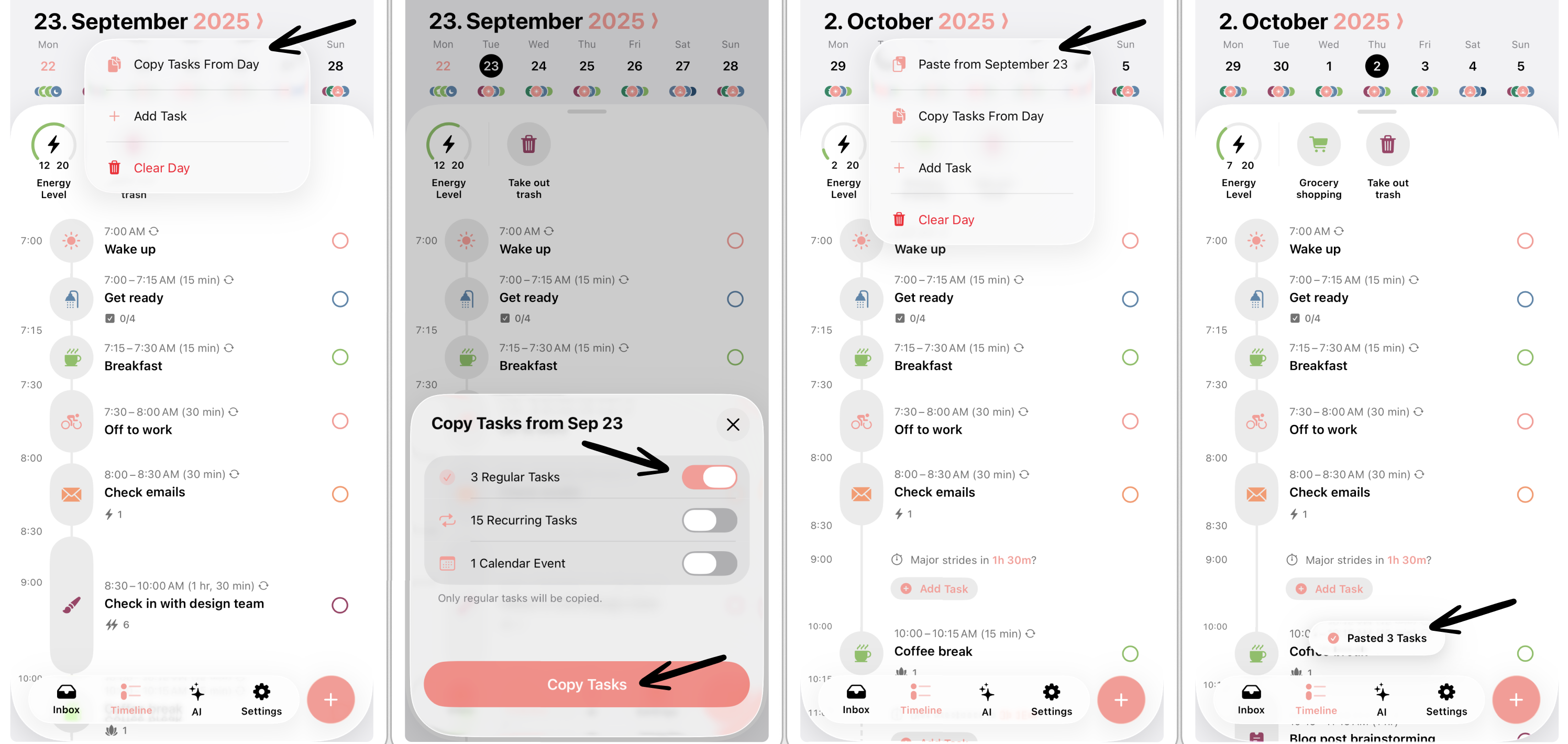 Copying tasks or a complete day can be useful, for example, if you did not manage to finish a task or have another day planned with a similar timeline.