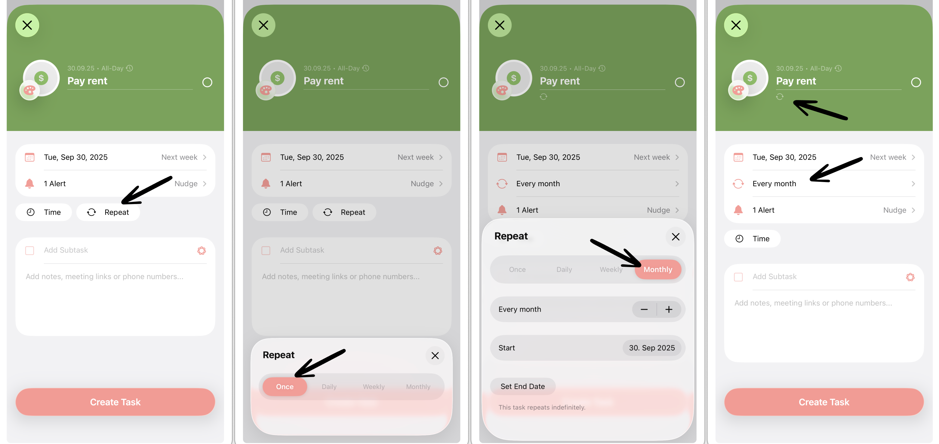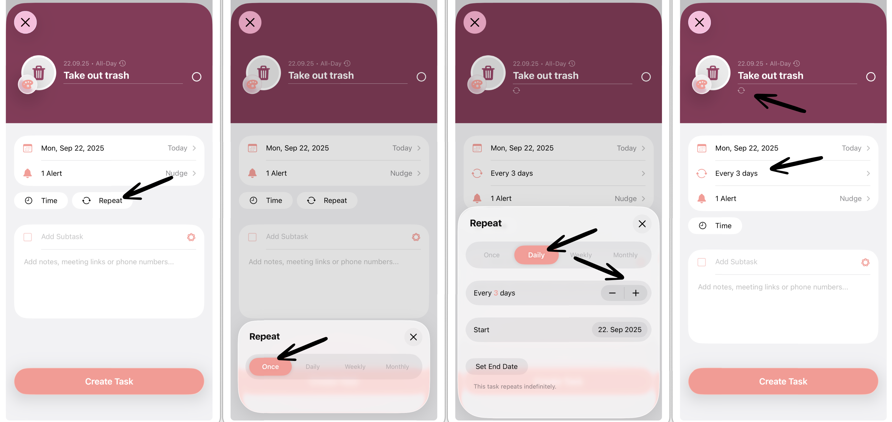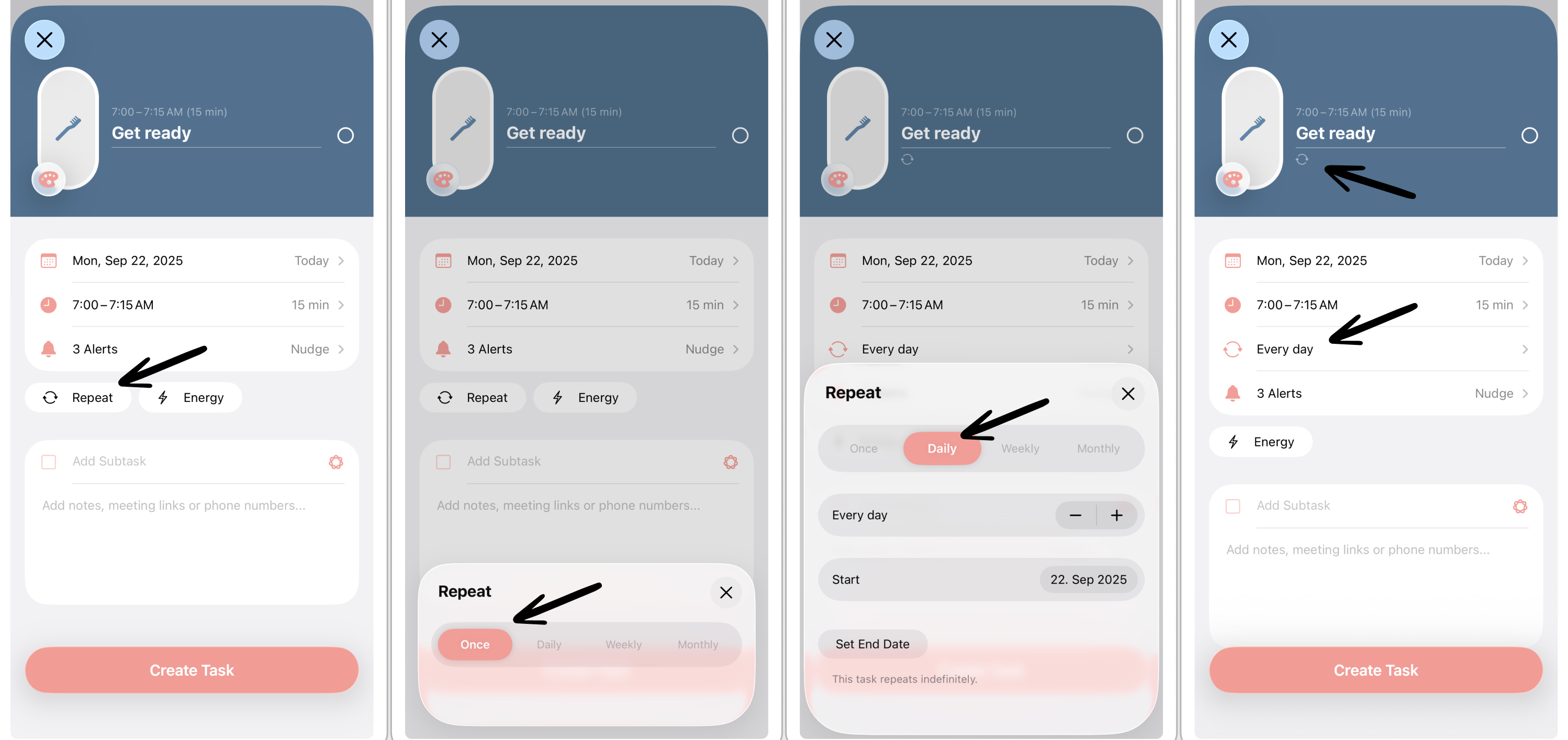 💡 You can adjust the recurrence frequency not only for daily tasks but also for weekly or monthly tasks.