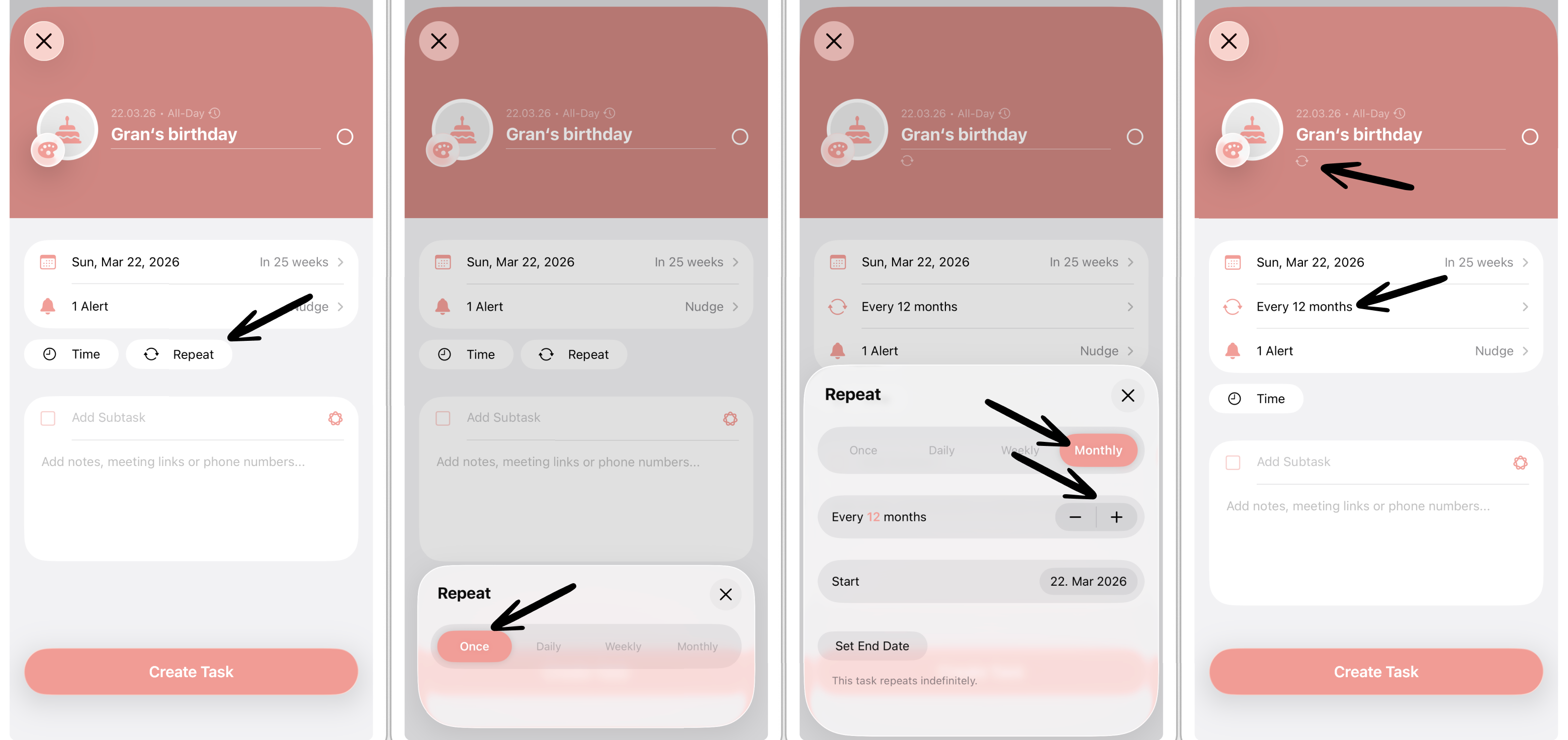 Even though there's not a specific yearly recurring task feature, you can still create them easily in Structured. This way, you will never forget your gran's birthday ever again.