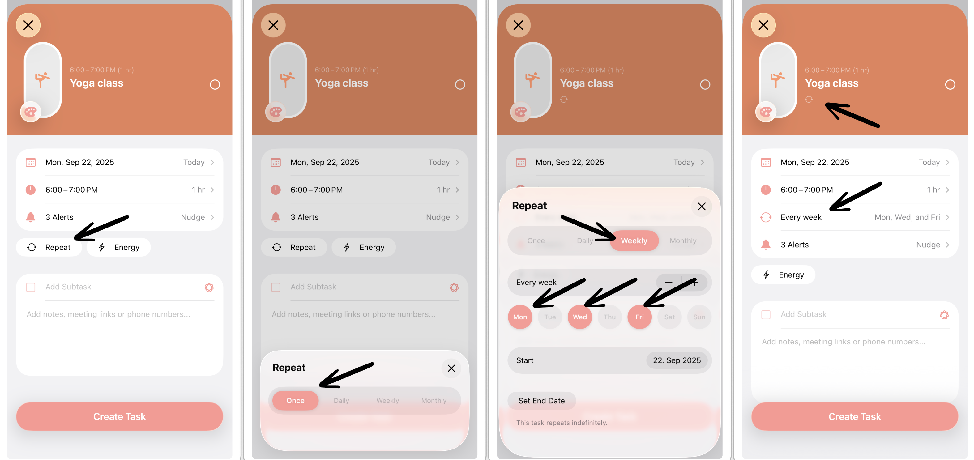 Once you tap Create Task, the weekly recurring task will appear in your timeline on the days it takes place.