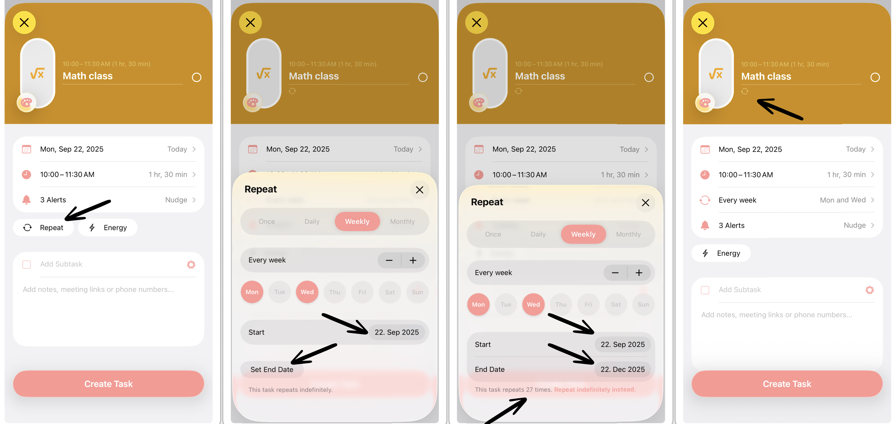 There are some ways to further customize your recurring tasks. For example, you can adjust the recurrence frequency or adjust the start and end date of your task or event.