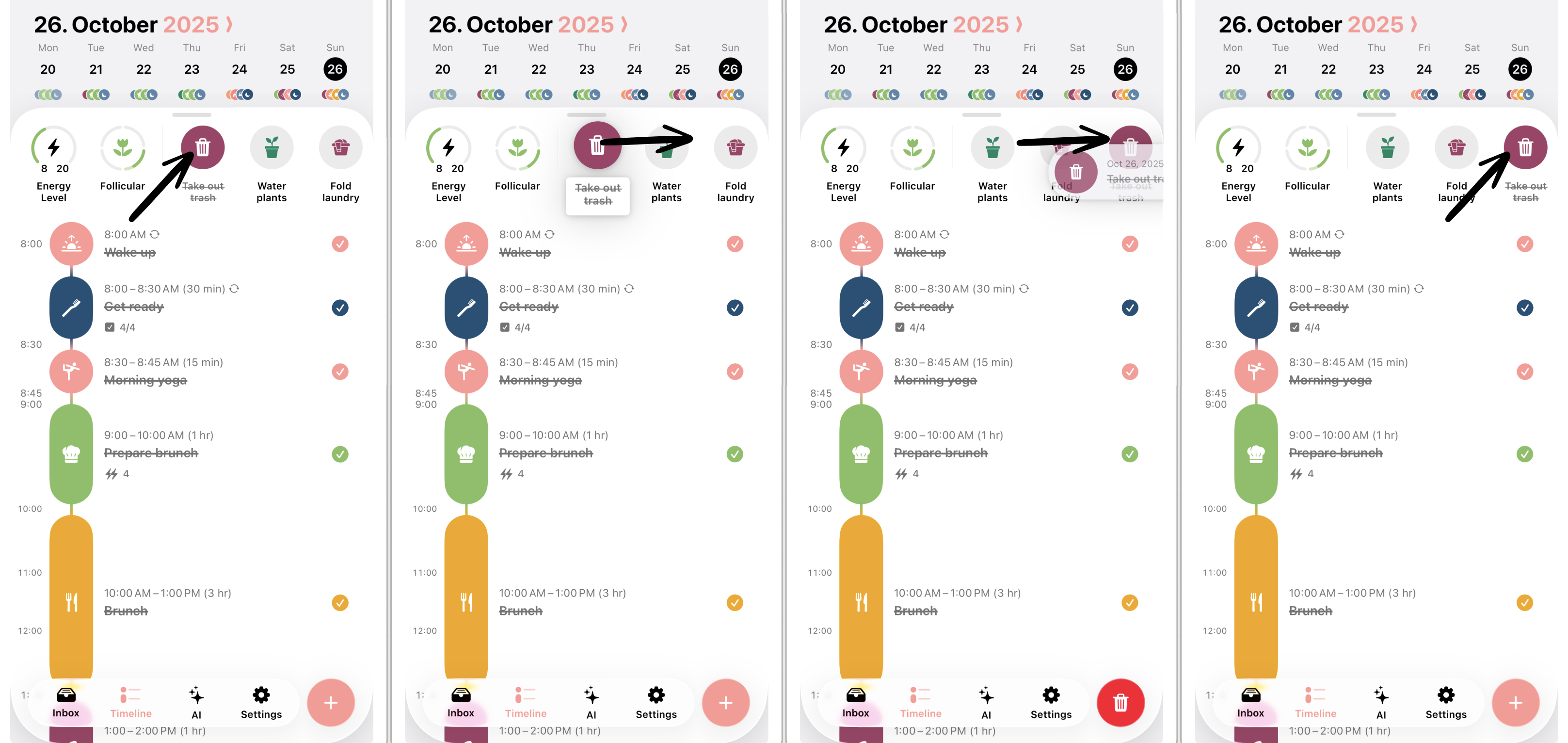 Drag and drop is a powerful feature, which helps you to organize your day. You can use drag and drop to either reschedule existing tasks, move tasks between your inbox and timeline, create or delete tasks quickly. Following, you will learn how to use the different drag and drop features.