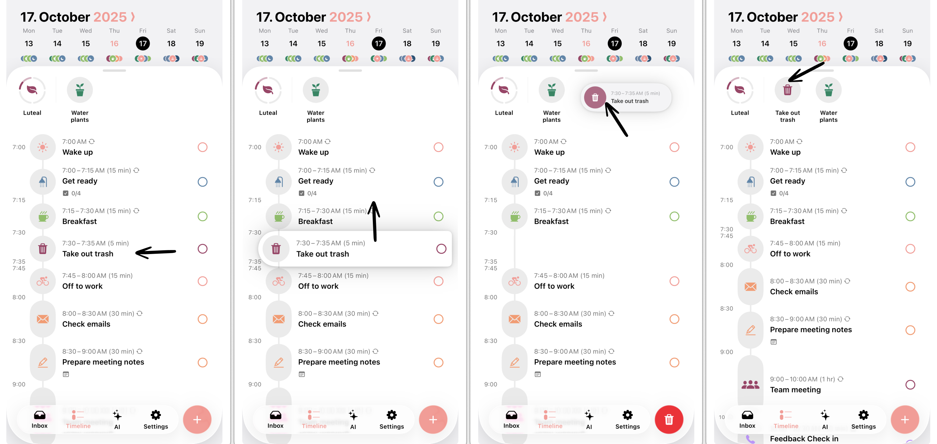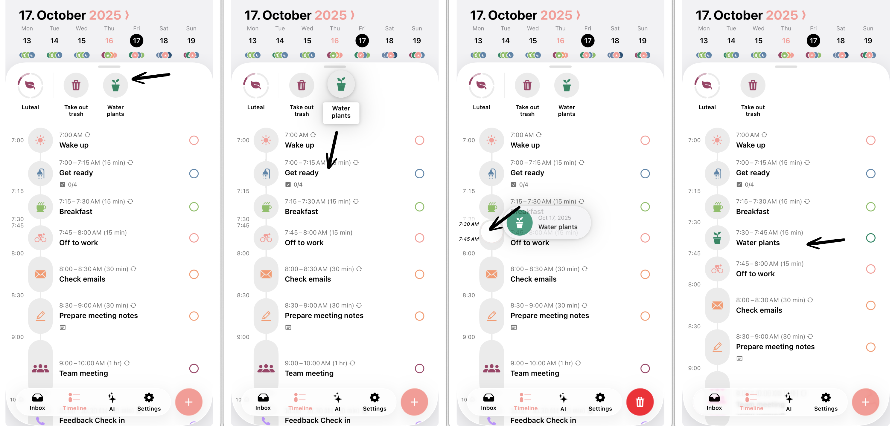 Drag and drop is a powerful feature, which helps you to organize your day. You can use drag and drop to either reschedule existing tasks, move tasks between your inbox and timeline, create or delete tasks quickly. Following, you will learn how to use the different drag and drop features.