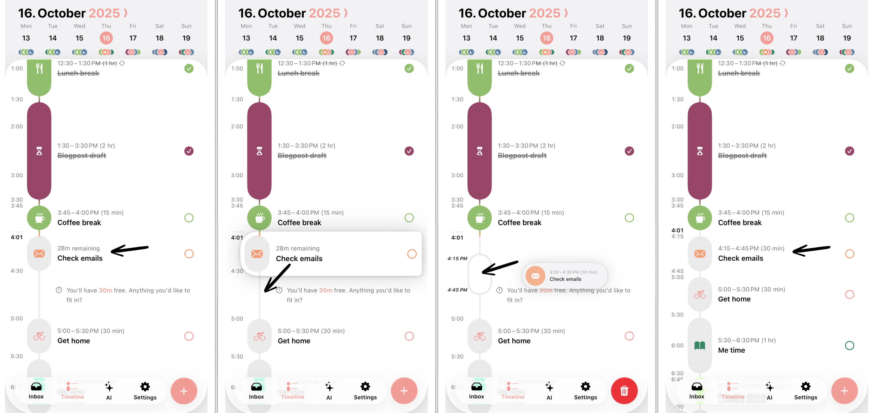 When your plans change because your coffee break takes longer than expected, you can easily drag a task to a new time slot or day. While dragging, a little preview will show, at which time the task will be dropped.